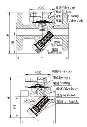 該閥根據閥腔內溫度的變化是成波紋管內感溫液體的汽化或冷凝,波紋管的內壓產生變化而驅使波紋管帶動閥芯作移位啟閉閥座孔,達到阻汽排水。